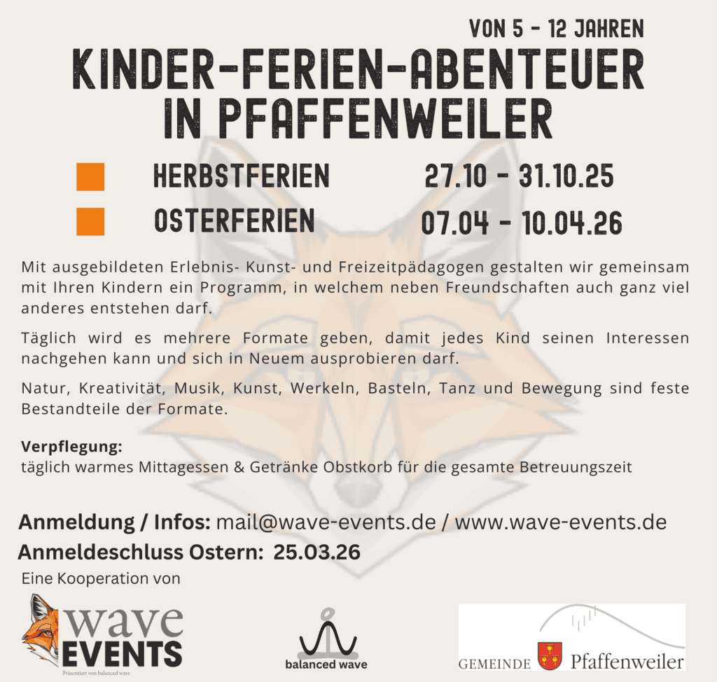 | Oster-Ferien-Abenteuer: | 07. – 10. April 2026 Kind 1: 185 € ab Kind 2: 170 € Betreuungszeit: 09:00-16:00 Uhr |